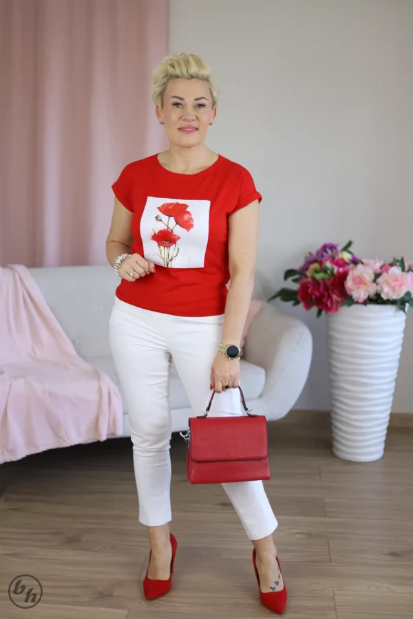 Bluzka w intensywnym odcieniu klasycznej czerwieni to doskonałe połączenie energetycznego koloru z subtelną elegancją. Centralnym punktem fasonu jest artystyczny nadruk przedstawiający maki, umieszczony na kontrastującym białym tle, który nadaje całości świeżości. Krótki rękaw wykończony delikatnym wywinięciem oraz klasyczny, okrągły dekolt sprawiają, że model ten jest niezwykle uniwersalny i komfortowy w codziennym użytkowaniu.