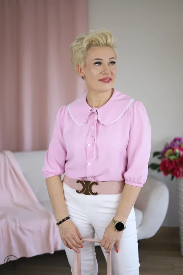 Elegancka bluzka w delikatnym odcieniu pastelowego różu, idealna do kobiecych stylizacji. Wykonana z gładkiego, lekkiego materiału, który pięknie się układa. Najbardziej charakterystycznym elementem jest duży, zaokrąglony kołnierz w stylu vintage, wykończony ozdobnym, białym haftem, co nadaje całości romantyczny charakter. Pod kołnierzem znajduje się subtelne wiązanie, które można sformować w kokardę. Bluzka jest zapinana z przodu na białe guziki, a jej bufiaste rękawy sięgają do łokcia i są zakończone elastyczną gumką, dodając sylwetce lekkości.