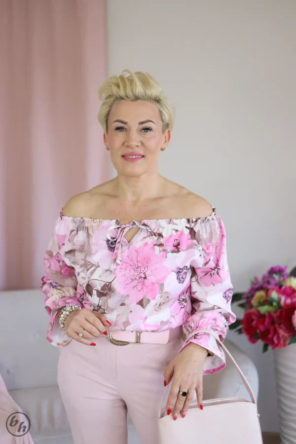 Urocza bluzka typu hiszpanka w piękny florystyczny wzór w kolorze pudrowego różu to kwintesencja romantycznego stylu i kobiecości. Charakteryzuje się ona efektownym, marszczonym dekoltem z gumką, który można nosić klasycznie lub zmysłowo opuścić na ramiona, a subtelne wiązanie na środku dodaje całości dziewczęcego uroku. Długie, zwiewne rękawy zostały zakończone elastycznymi ściągaczami, tworząc delikatne falbanki przy nadgarstkach, co nadaje sylwetce lekkości i wdzięku.