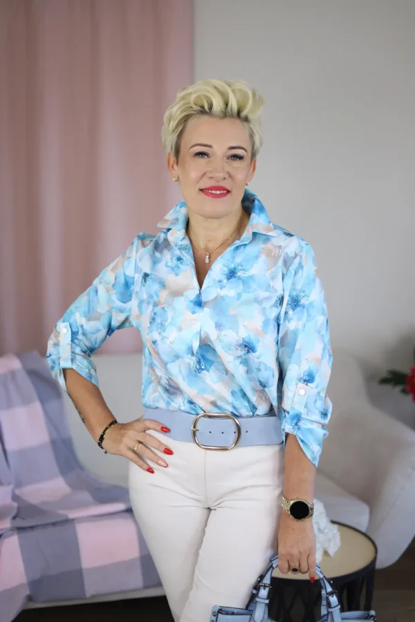 Elegancka Koszula w Kwiatowy Wzór błękitna akwarela. Dodaj powiewu świeżości do swojej garderoby dzięki wyjątkowej koszuli o malarskim, kwiatowym wzorze. Ten model to idealne połączenie klasycznego kroju z nowoczesnym, artystycznym printem w odcieniach błękitu, lazuru i delikatnego beżu.