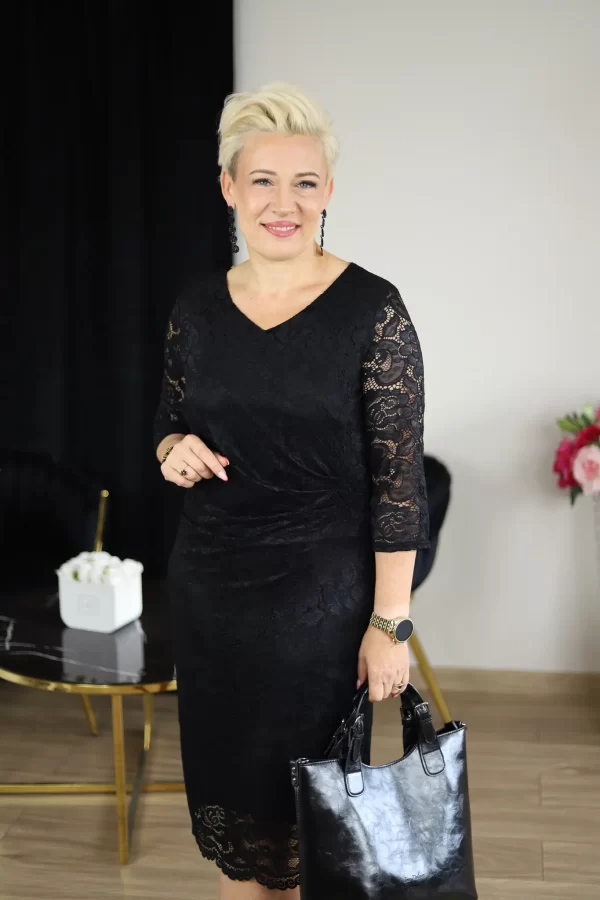 Sukienka o długości do kolan. Posiada elegancki dekolt w kształcie litery „V” oraz rękawy o długości 3/4. Charakterystycznym elementem jest delikatne marszczenie z boku dekoltu, które dodaje jej subtelnej elegancji i oryginalności. Sukienka wykonana jest z gładkiego, jednolitego materiału, co sprawia, że jest uniwersalna i nadaje się na wiele okazji.