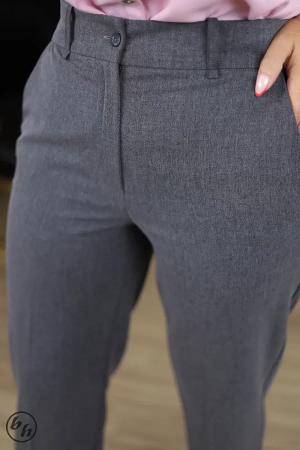 Damskie spodnie o klasycznym kroju, idealne do stylizacji biznesowych, biurowych lub bardziej eleganckich. Spodnie mają proste, lekko zwężające się nogawki. Charakterystyczne są dla nich kant z przodu, biegnący przez całą długość nogawki, co dodaje im formalnego charakteru. Wysoki stan, zapięcie na guzik i ukryty suwak, oraz szlufki do paska.