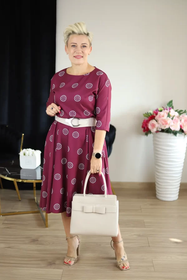 Sukienka z paskiem to kwintesencja elegancji w codziennym wydaniu. Wykonana z przyjemnego w dotyku materiału, zapewnia komfort noszenia przez cały dzień. Klasyczny kołnierzyk oraz wiązanie w talii które pięknie podkreśla sylwetkę. Rękawy o długości 3/4 zakończone subtelnym ściągaczem dodają całości lekkości i kobiecego charakteru. Rozcięcie z przodu nadaje sukience swobody i eleganckiego wdzięku. Model idealny do pracy, spotkań biznesowych czy eleganckich wyjść. Skład: 70% wiskoza 30% poliester