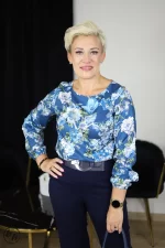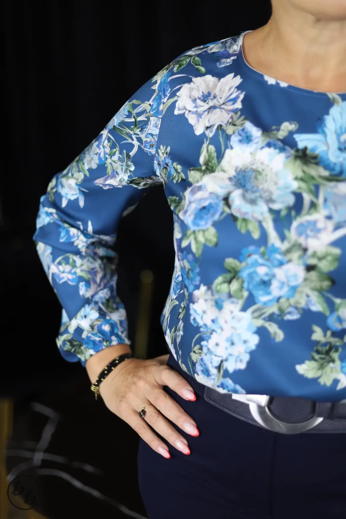 Bluzka z długimi rękawami zakończone gumką, wyróżniająca się wyrazistym, kwiecistym wzorem. Tło bluzki jest w pięknym odcieniu niebieskiego, na którym rozmieszczone są liczne kwiaty i liście w różnych tonacjach błękitu, bieli i granatu. Bluzka ma okrągły dekolt typu łódka, a jej rękawy są wykończone delikatnym marszczeniem lub gumką przy nadgarstkach, nadając im modny, lekko bufiasty kształt. Całość tworzy kobiecą i dynamiczną stylizację, idealnie komponującą się z ciemnymi, granatowymi spodniami.