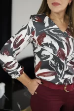Bluzka ma długie, luźne rękawy, które są zebrane na końcach za pomocą gumki, tworząc delikatną bufkę. Taki sam element zastosowano u dołu bluzki, dzięki czemu materiał układa się swobodnie, ale jednocześnie dopasowuje do sylwetki, podkreślając talię. Dekolt w szpic i wzorzysta tkanina z abstrakcyjnym printem sprawiają, że bluzka jest uniwersalna i łatwa do łączenia z innymi elementami garderoby.