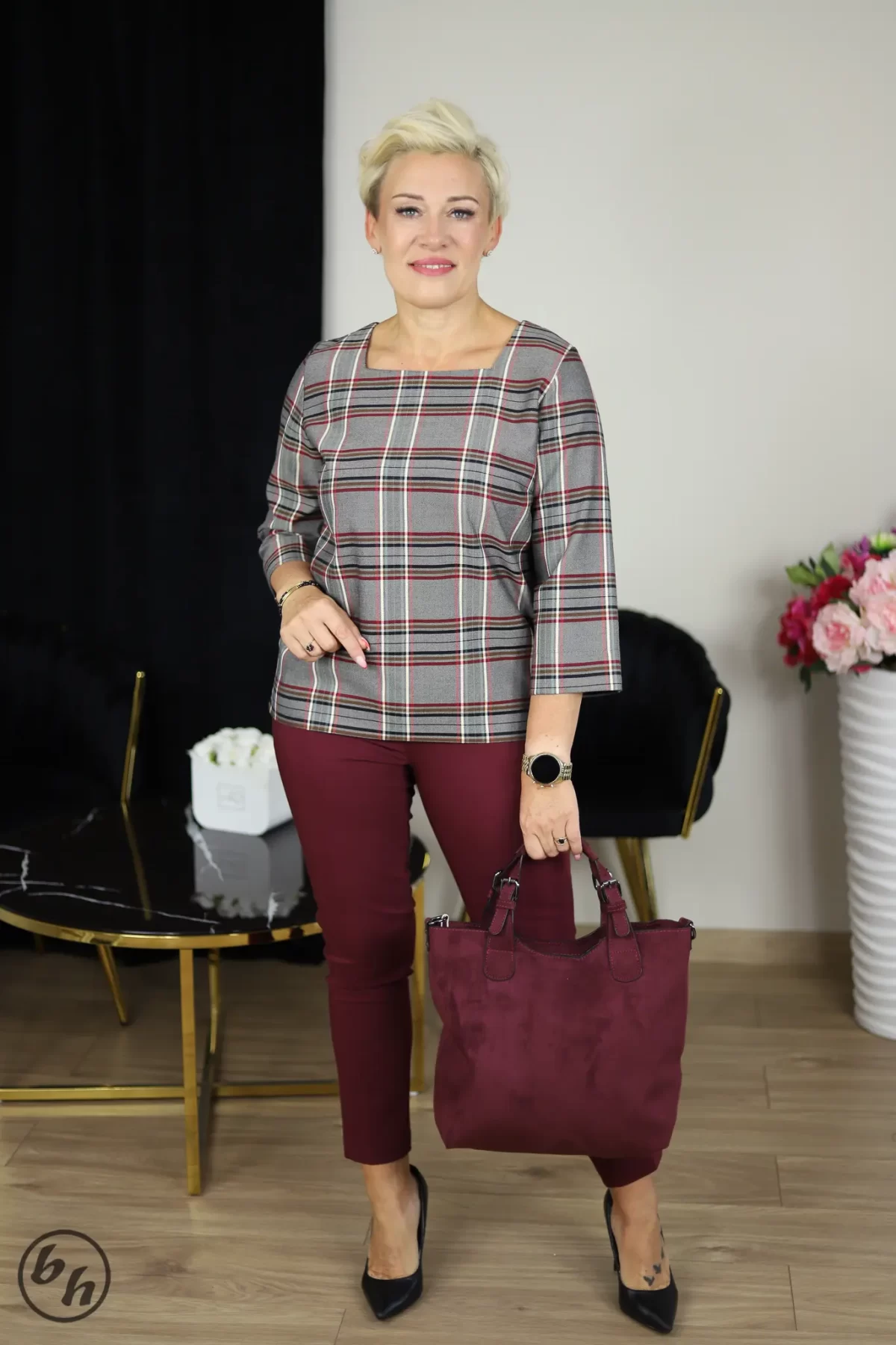 Bluzka w kratę, której dominującym kolorem jest szary. Krata jest klasyczna i składa się z cienkich linii w kolorach czarnym, białym i bordowym. Bluzka ma kwadratowy dekolt  i rękawy o długości 3/4. Ma luźniejszy krój.