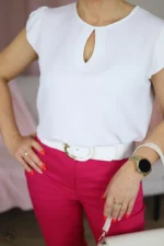 Elegancka bluzka damska z gładkiego, lekkiego materiału. Fason charakteryzuje się prostym krojem i okrągłym dekoltem, który zdobi dekoracyjne wycięcie w kształcie łezki, subtelnie eksponujące mostek. Uroku całości dodają krótkie, delikatnie marszczone rękawy w stylu motylkowym, które nadają sylwetce lekkości i kobiecego wdzięku. Bluzka stanowi doskonałą bazę do zarówno eleganckich, jak i bardziej casualowych stylizacji.