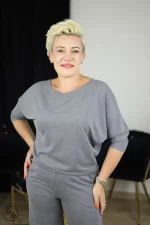 Bluzka o luźnym, nietoperzowym kroju. Posiada okrągły, łódkowy dekolt, który elegancko eksponuje obojczyki. Bluzka wykonana jest z lekkiego, lejącego się materiału, który swobodnie układa się na sylwetce, zapewniając komfort noszenia.