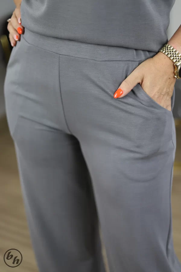 Spodnie z szerokimi nogawkami. Gładkie w jednolitym kolorze. Spodnie ładnie układają się w ruchu. Doskonale komponują się z bluzką z tej samej linii. Model, który zapewni Ci styl oraz swobodę. Skład: