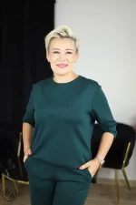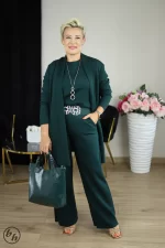 Garnitur damski składający się z luźnego i przedłużanego żakietu oraz spodni w gumkę z dwoma bocznymi kieszeniami. Model sprawdzi się na wiele okazji jak również do codziennego użytku.