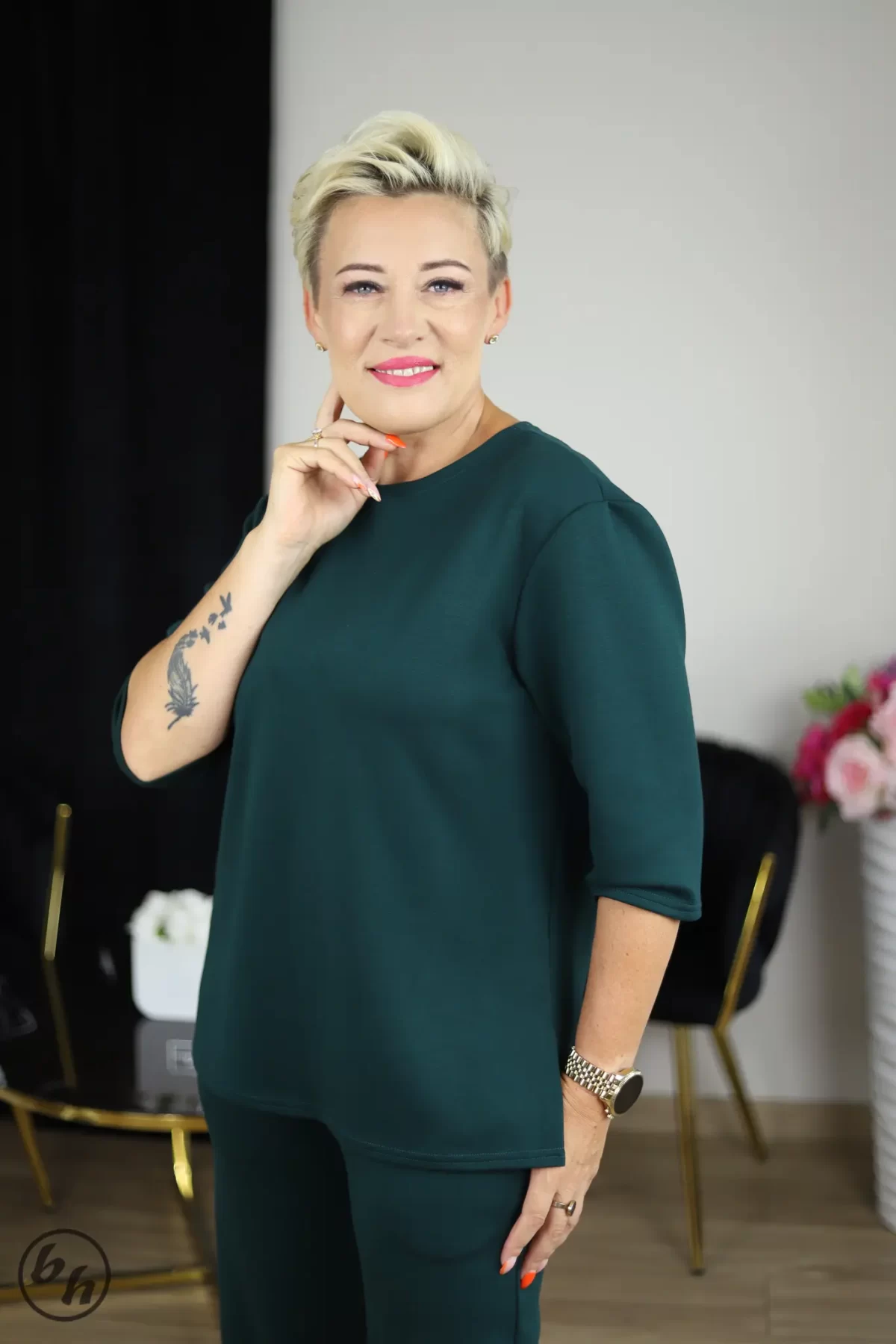 Bluzka o luźnym, nietoperzowym kroju. Posiada okrągły, łódkowy dekolt, który elegancko eksponuje obojczyki. Bluzka wykonana jest z lekkiego, lejącego się materiału, który swobodnie układa się na sylwetce, zapewniając komfort noszenia.
