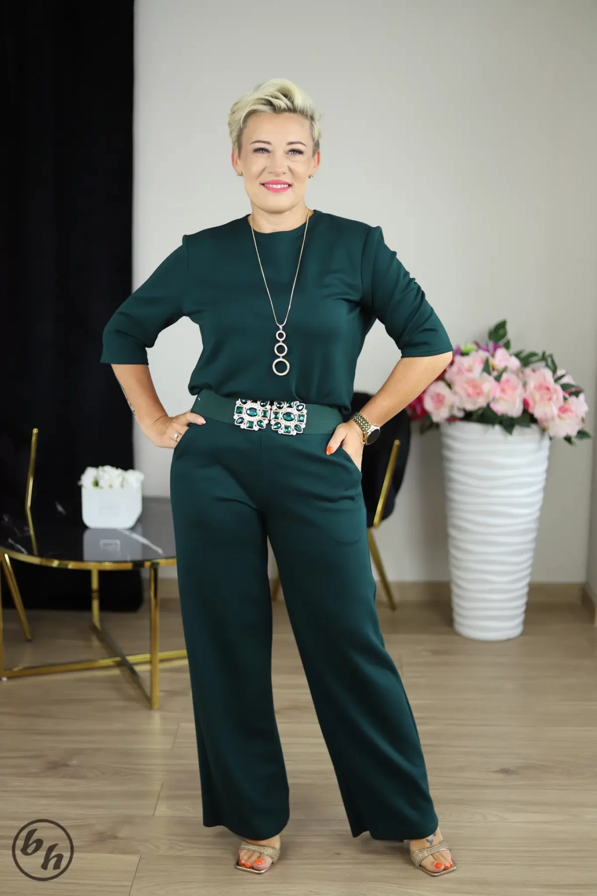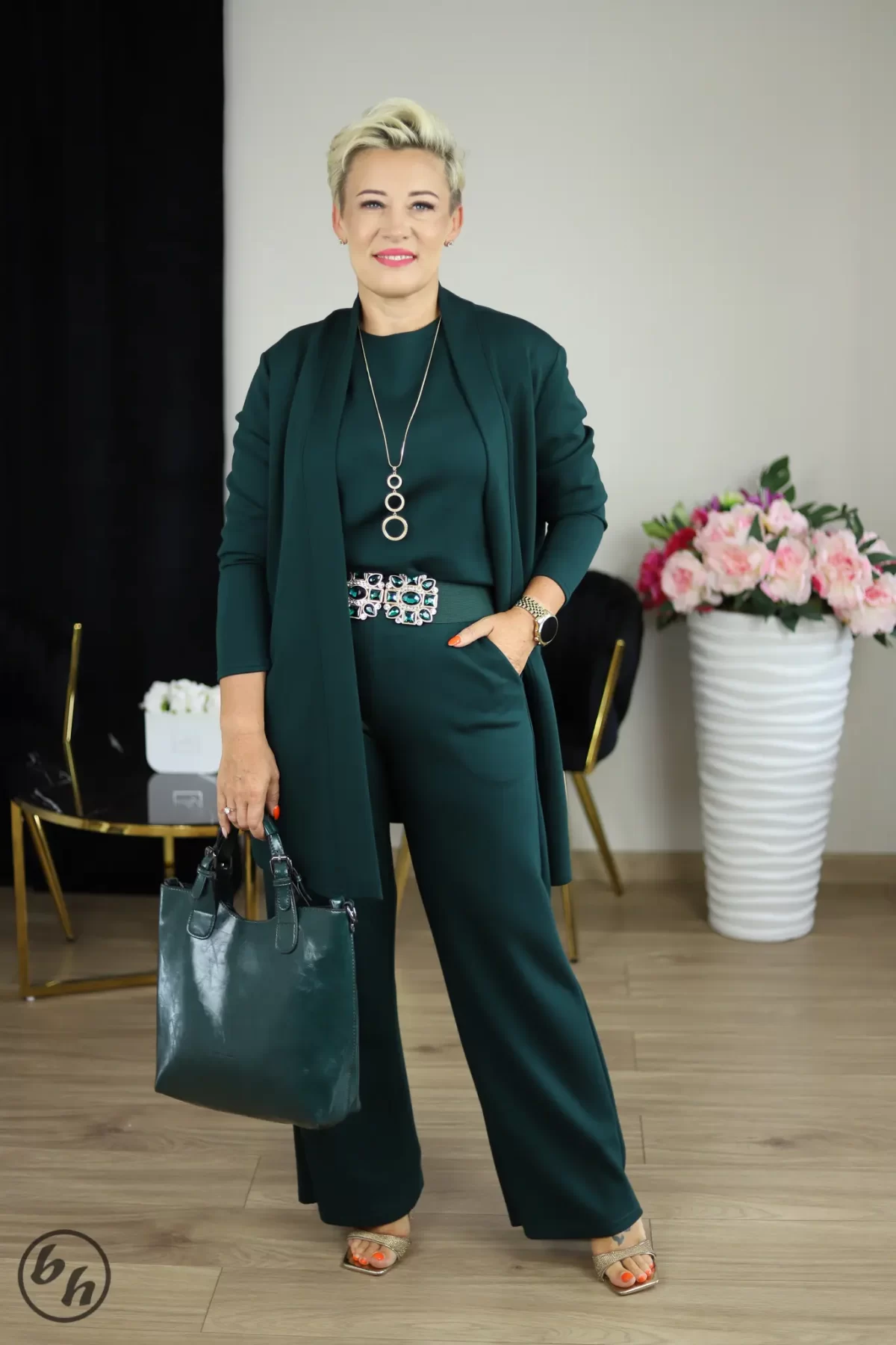 Luźny fason. Nie zapinany żakiet z klasycznymi klapami, lekko przedłużany. Z rękawem trzy czwarte z podpięciem. Spodnie z gumką w pasie oraz dwoma bocznymi kieszeniami. Tworzą piękny, elegancki i bardzo szykowny damski garnitur, który sprawdzi się na wiele okazji.