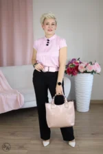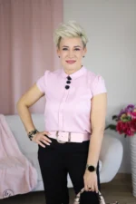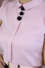 Ta elegancka bluzka charakteryzuje się dopasowanym fasonem z krótkimi rękawkami, które nadają sylwetce subtelny, kobiecy kształt. Głównym punktem dekoracyjnym jest klasyczny, zaokrąglony kołnierzyk typu bebe, pod którym umieszczono pionowy rząd trzech wypukłych aplikacji w kształcie róż, pełniących rolę ozdobnych guzików. Minimalistyczny krój sprawia, że całość prezentuje się bardzo schludnie i profesjonalnie, idealnie wpisując się w stylizacje biznesowe lub wizytowe.