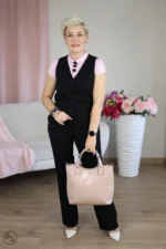Kamizelka jest częścią formalnego, damskiego garnituru. Jest to kamizelka z pełnym przodem i tyłem, zapinana na środku na cztery kontrastujące, ciemne guziki, które stanowią centralny element dekoracyjny. Krój kamizelki jest dopasowany do sylwetki, podkreślając talię, co widać po subtelnych zaszewkach i linii bocznej. Materiał jest gładki, matowy i strukturalny, co nadaje całości eleganckiego i profesjonalnego wyglądu.