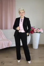 Luźny fason. Nie zapinany żakiet z klasycznymi klapami, lekko przedłużany. Z rękawem trzy czwarte z podpięciem. Spodnie z gumką w pasie oraz dwoma bocznymi kieszeniami. Tworzą piękny, elegancki i bardzo szykowny damski garnitur, który sprawdzi się na wiele okazji.