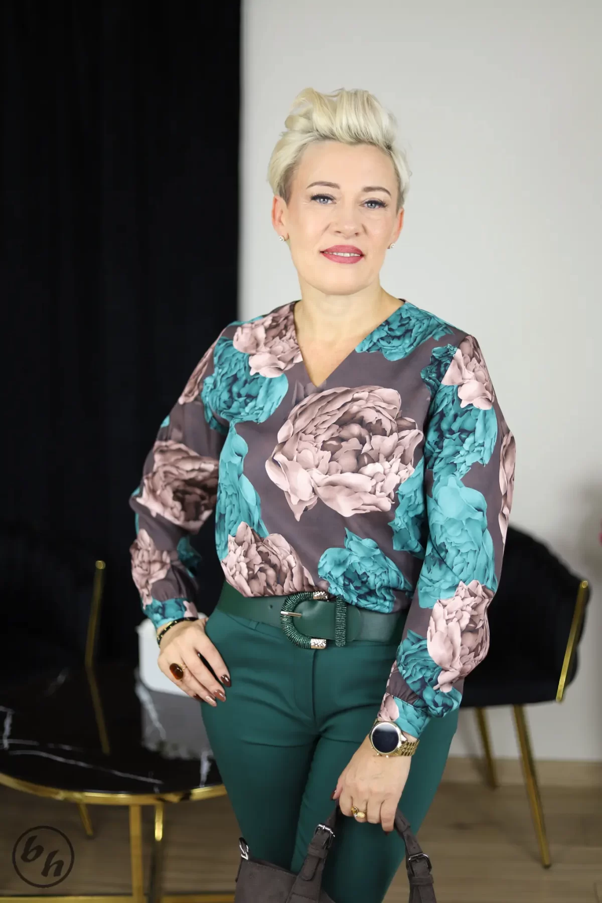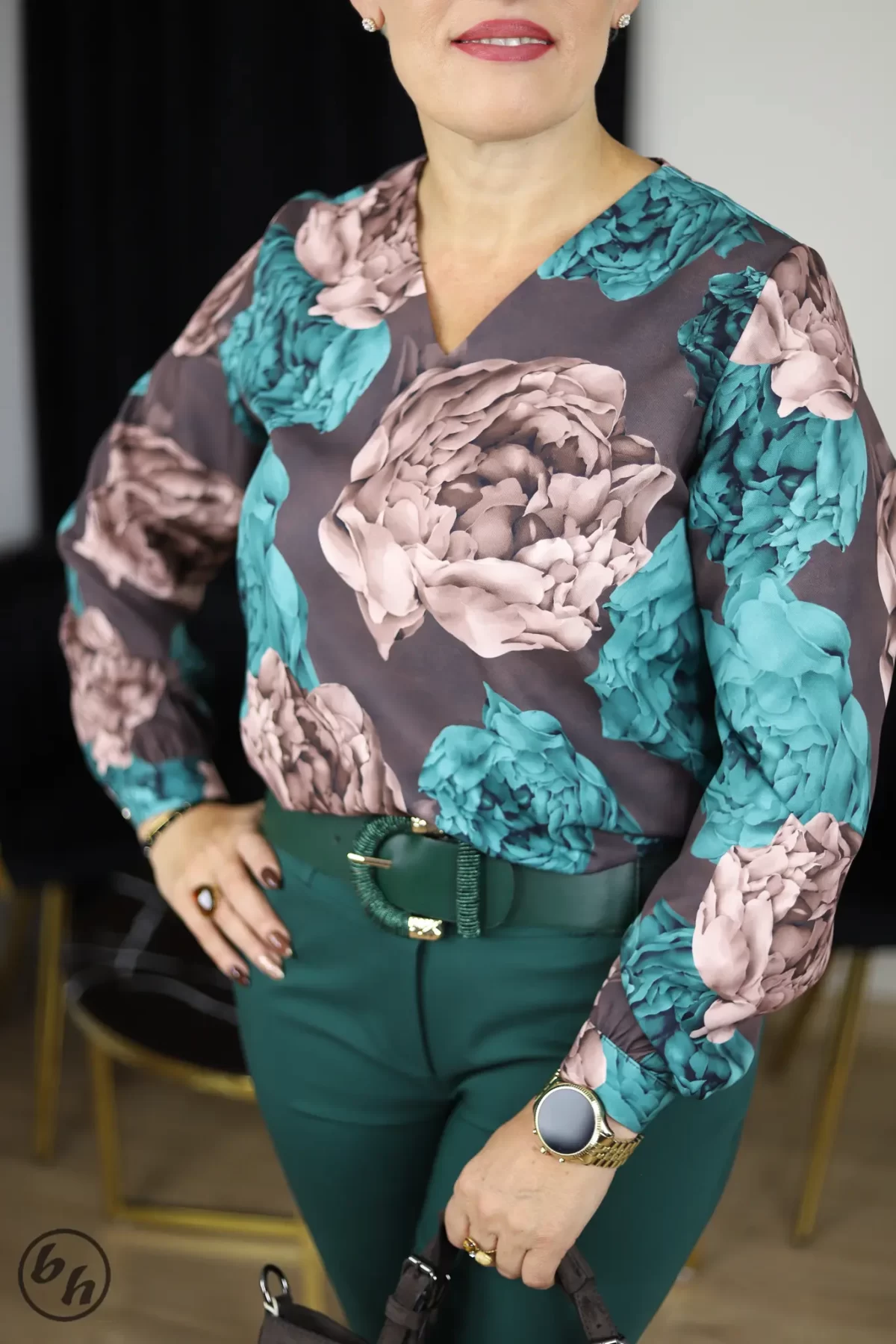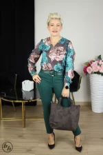Elegancka bluzka z długim rękawem, która doskonale sprawdzi się w stylizacjach biznesowych i casualowych. Wyróżnia się głębokim dekoltem w kształcie litery V, subtelnie eksponującym szyję. Tkanina pokryta jest wyrazistym, florystycznym wzorem dużych kwiatów w modnych odcieniach. Dół bluzki jest prosty, co umożliwia swobodne noszenie jej na wierzchu lub eleganckie wpuszczenie w spódnicę czy spodnie. Rękawy zakończone są delikatnymi mankietami. To idealny wybór dla kobiet ceniących sobie połączenie wygody z wyrafinowanym wzornictwem.