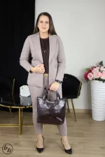 Marynarka o dopasowanym kroju podkreśla sylwetkę, a klasyczny kołnierz oraz delikatne wykończenia dodają jej stylu i formalnego charakteru. Spodnie w tym samym odcieniu doskonale komponują się z marynarką, tworząc spójną całość, która sprawdzi się zarówno w biurze, jak i na eleganckich spotkaniach. To doskonały wybór dla nowoczesnych kobiet, które chcą wyglądać profesjonalnie, nie rezygnując z kobiecego wdzięku.