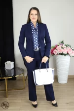 Luźny fason. Nie zapinany żakiet z klasycznymi klapami, lekko przedłużany. Z rękawem trzy czwarte z podpięciem. Spodnie z gumką w pasie oraz dwoma bocznymi kieszeniami. Tworzą piękny, elegancki i bardzo szykowny damski garnitur, który sprawdzi się na wiele okazji.