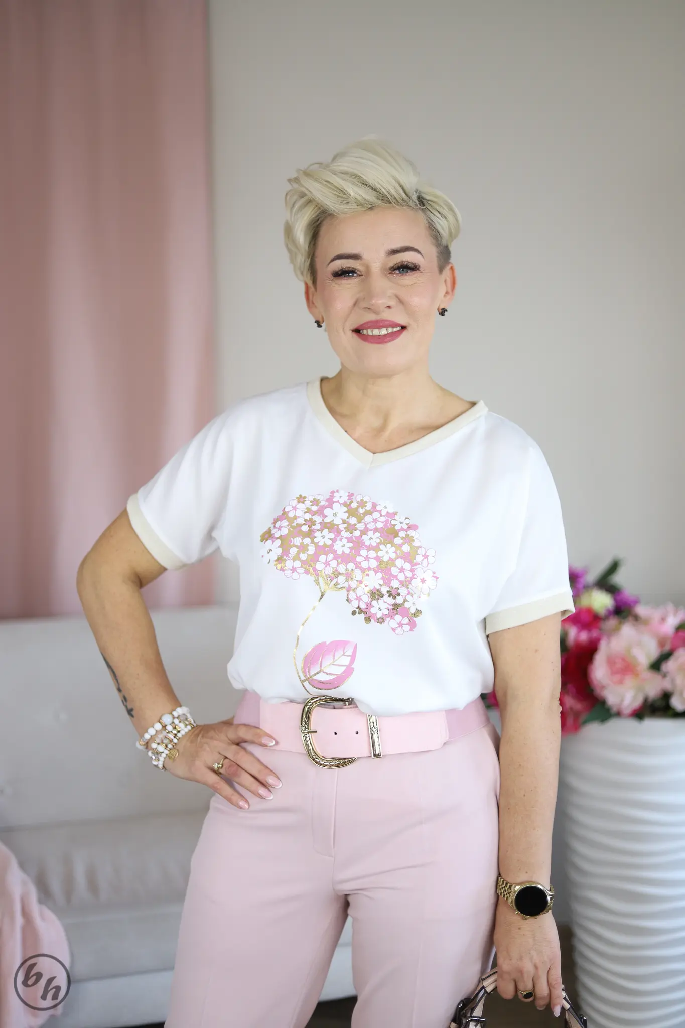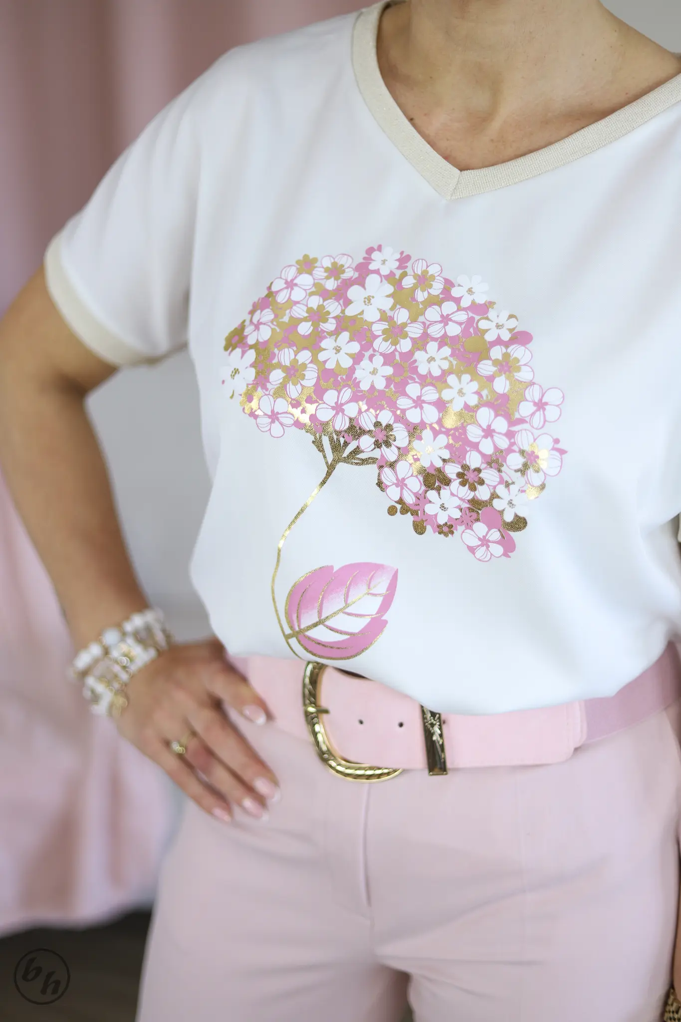 Bluzka o swobodnym kroju łączy w sobie wygodę t-shirtu z eleganckimi detalami, co czyni ją idealną propozycją na co dzień. Posiada krótkie rękawy oraz dekolt w kształcie litery V, które zostały wykończone kontrastującą, gładką lamówką, nadającą całości sportowej elegancji. Głównym elementem dekoracyjnym jest duży, artystyczny nadruk na froncie, przedstawiający okazały kwiat hortensji. Grafika składa się z licznych drobnych kwiatuszków w odcieniach różu i bieli, wzbogaconych o subtelne, złote akcenty, które delikatnie rozświetlają projekt.