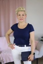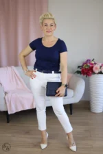 Bluzka o klasycznym kroju z dekoltem w kształcie litery V i krótkimi rękawami, idealnie dopasowująca się do sylwetki. Jej minimalistyczny design sprawia, że jest wszechstronnym elementem garderoby, doskonale sprawdzającym się zarówno w eleganckich, jak i casualowych stylizacjach. Wygodny materiał zapewnia komfort noszenia przez cały dzień, a prosty fason podkreśla subtelną elegancję.
