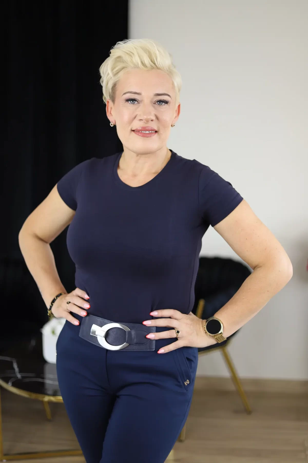 Bluzka o klasycznym kroju z dekoltem półokrągłym i krótkimi rękawami, idealnie dopasowująca się do sylwetki. Jej minimalistyczny design sprawia, że jest wszechstronnym elementem garderoby, doskonale sprawdzającym się zarówno w eleganckich, jak i casualowych stylizacjach. Wygodny materiał zapewnia komfort noszenia przez cały dzień, a prosty fason podkreśla subtelną elegancję.