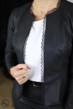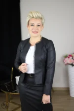 Prezentujemy stylowe, krótkie bolerko z długimi rękawami, które doskonale uzupełni każdą elegancką stylizację. Wykonane z wysokiej jakości ekoskóry w kolorze klasycznej czerni, bolerko ma fason idealnie dopasowujący się do sylwetki. Charakterystycznym elementem jest delikatna, czarna koronkowa lamówka, która subtelnie zdobi dekolt, dodając całości kobiecego uroku i finezji. Bolerko jest lekkie i wygodne, stanowiąc świetną alternatywę dla żakietu, idealne na chłodniejsze dni lub wieczorne wyjścia. To wszechstronny element garderoby, który z łatwością połączysz zarówno z sukienkami, spódnicami, jak i eleganckimi spodniami.