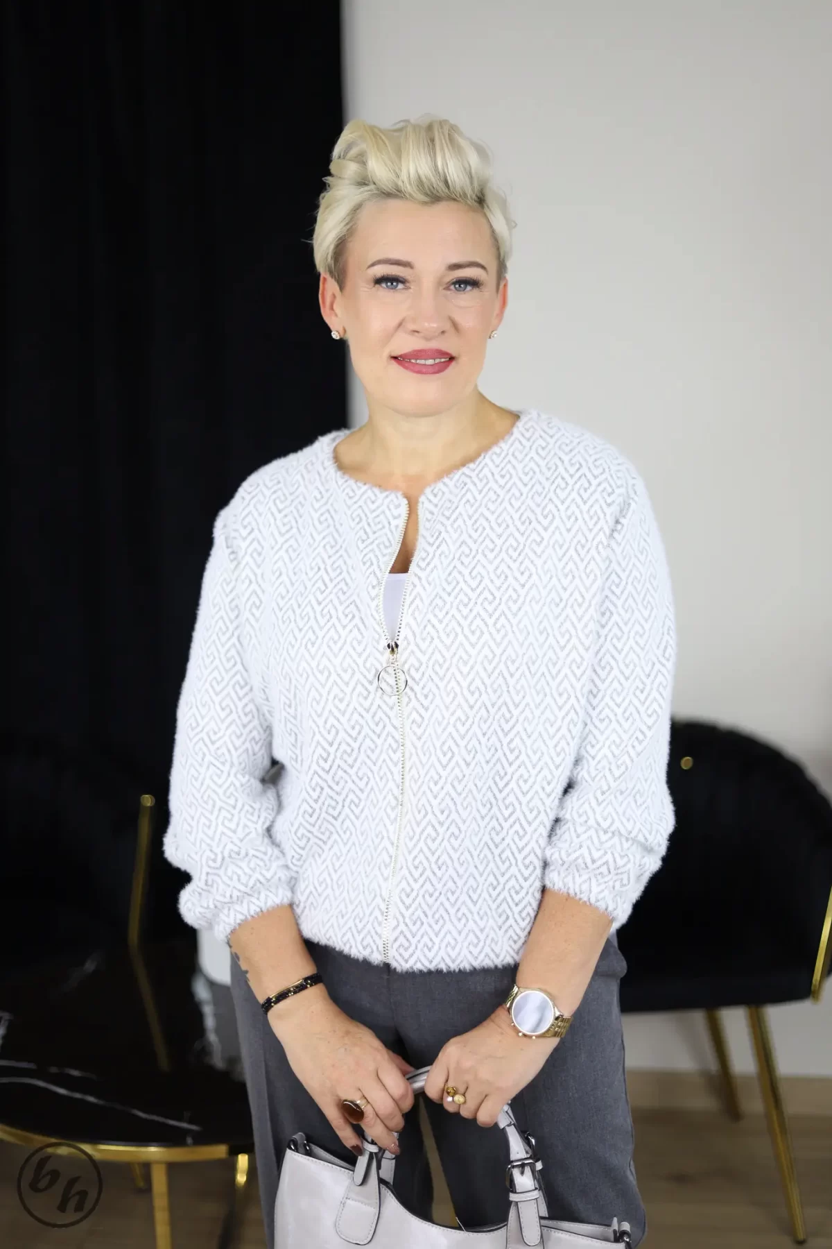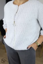 Krótka, stylowa bomberka o luźnym, modnym kroju, wykonana z puszystej i przyjemnej w dotyku dzianiny typu „alpaka” z charakterystycznym, delikatnie włochatym wykończeniem. Sweter zdobi regularny, geometryczny wzór w kształcie greckiej kraty (meandra) w kontrastowym, jaśniejszym odcieniu. Bomberka zapinana jest na srebrny zamek błyskawiczny z ozdobnym, okrągłym uchwytem. Posiada okrągły dekolt bez kołnierza oraz długie rękawy.