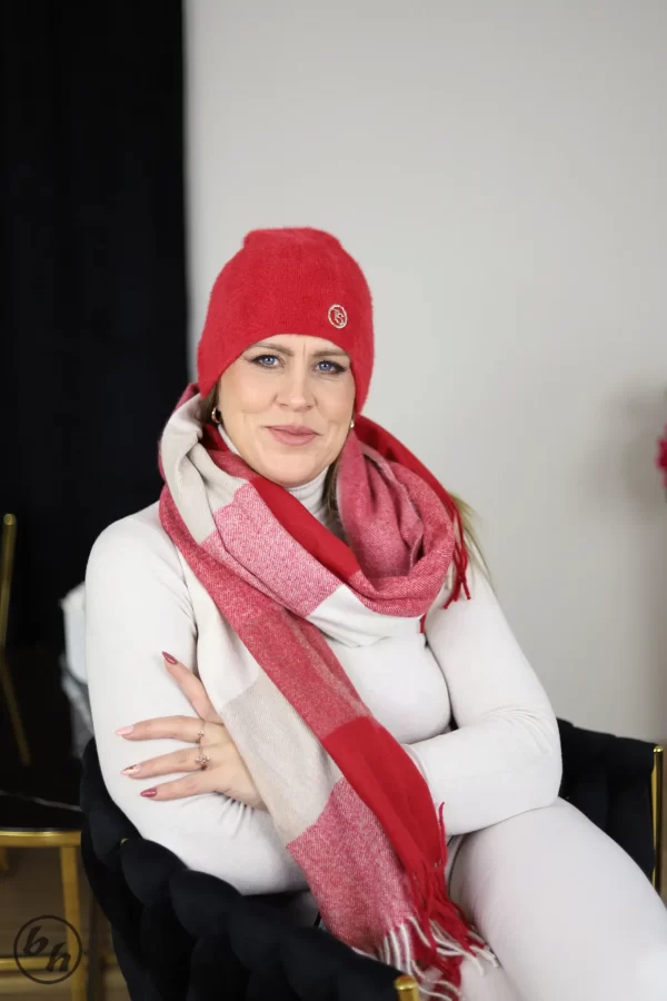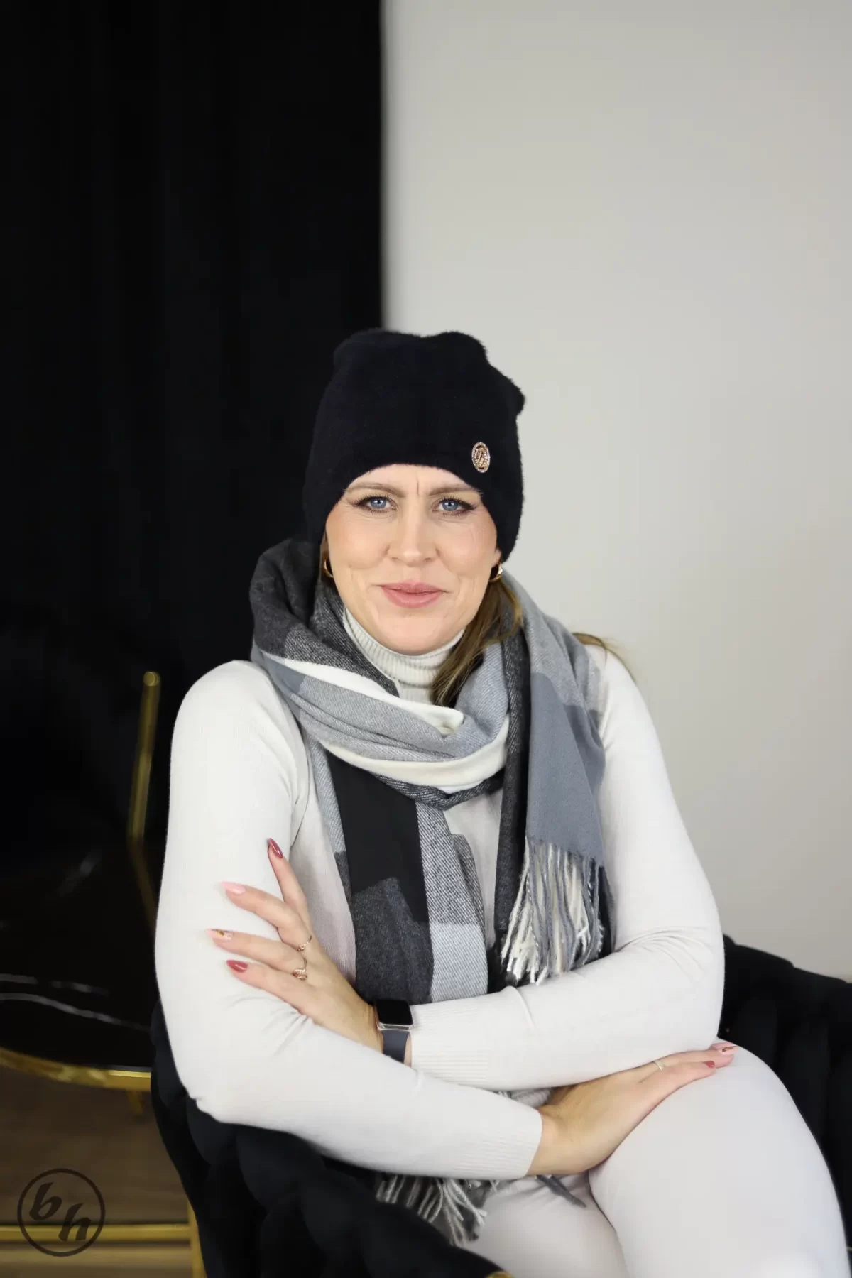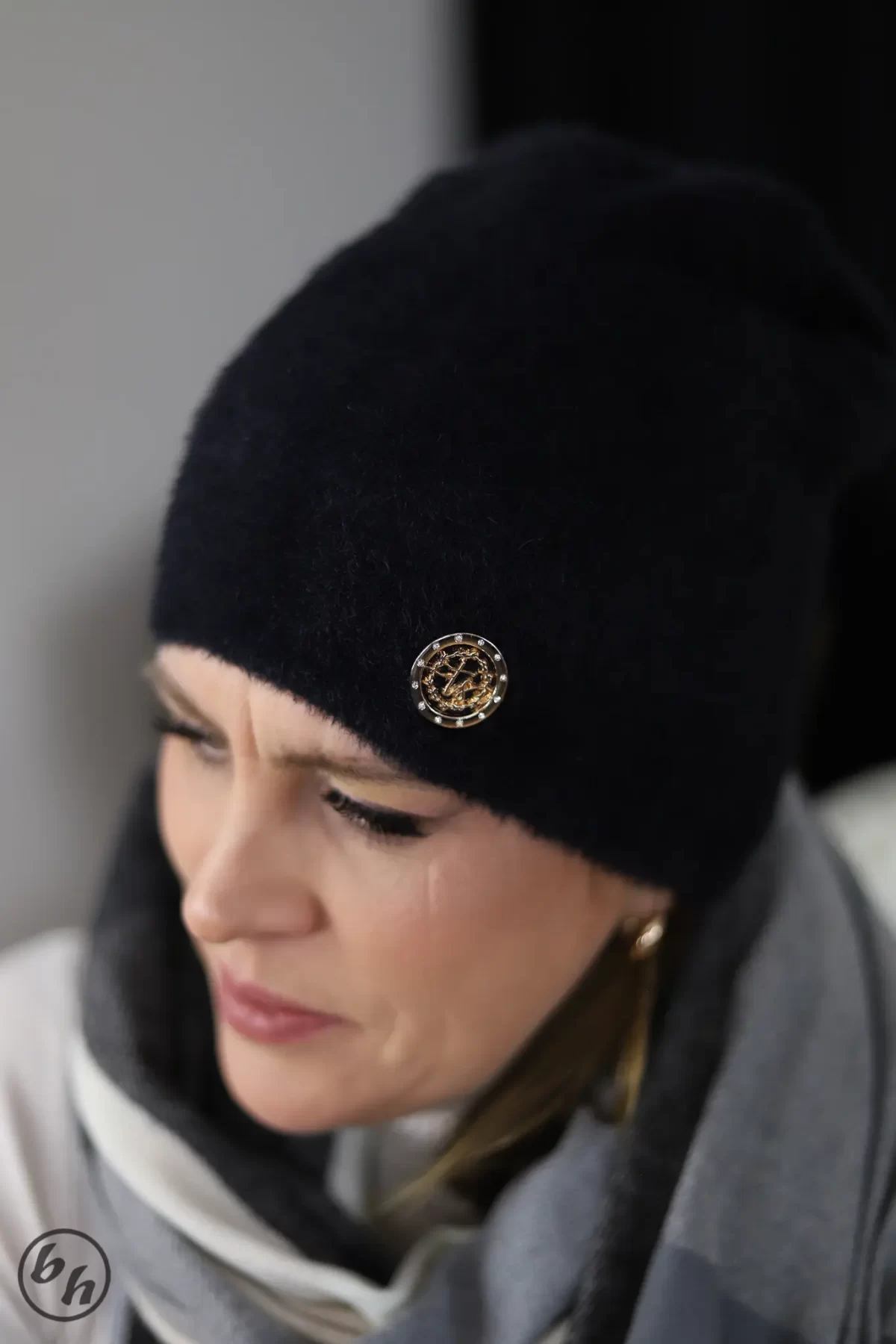 Przytulny i puszysty dodatek, idealny na chłodniejsze dni. Wykonana z materiału przypominającego alpakę, która zapewnia ciepło i jest przyjemna w dotyku. Z przodu, nieco z boku, umieszczona jest okrągła, metalowa ozdoba w kolorze złotym. Jest to ciepła i stylowa czapka, która łączy komfort z subtelnym, ozdobnym detalem.