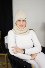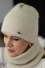 Komplet składa się z czapki i komina wykonanych z tej samej, wyjątkowo miękkiej i puszystej przędzy. Tkanina ma wyraźną, włochatą fakturę, co nadaje zestawowi bardzo ciepły i przytulny charakter. Zestaw jest jednolity stylistycznie, idealnie dopasowany do jesienno-zimowych stylizacji.