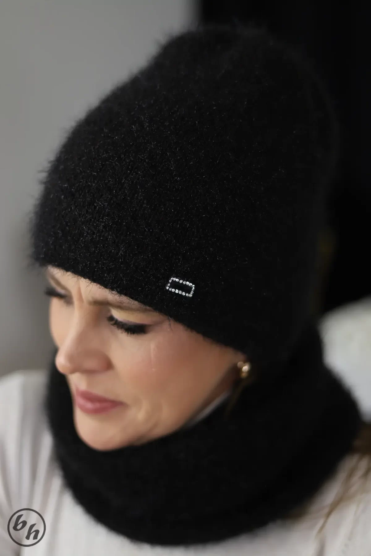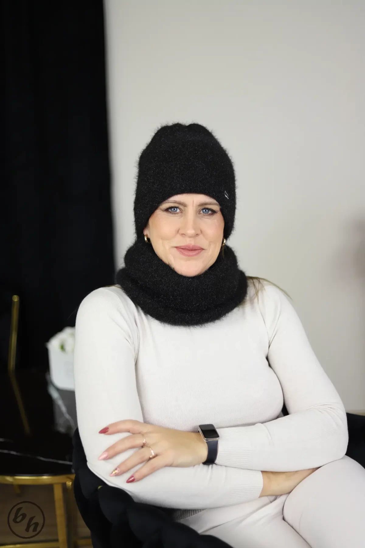 Komplet składa się z czapki i komina wykonanych z tej samej, wyjątkowo miękkiej i puszystej przędzy. Tkanina ma wyraźną, włochatą fakturę, co nadaje zestawowi bardzo ciepły i przytulny charakter. Zestaw jest jednolity stylistycznie, idealnie dopasowany do jesienno-zimowych stylizacji.