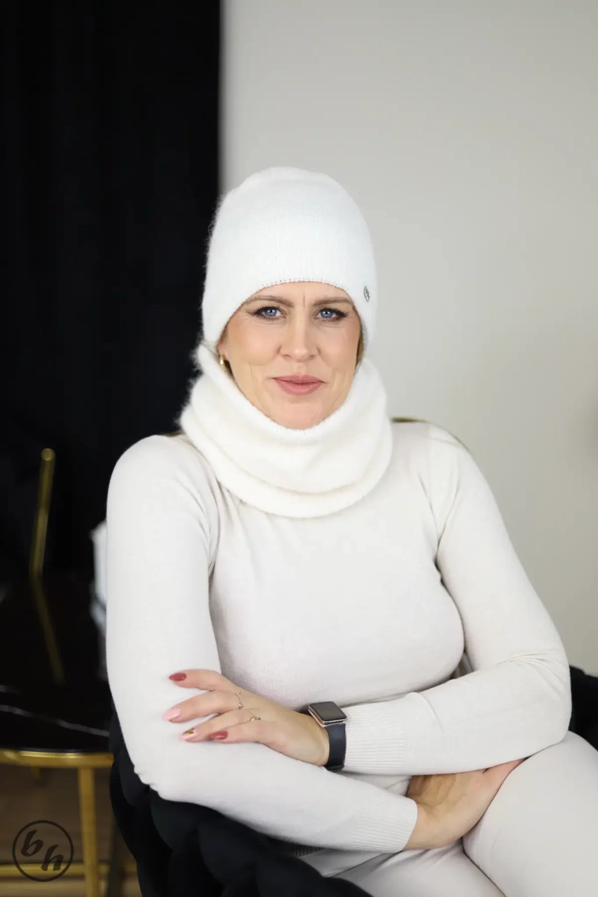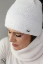 Komplet składa się z czapki i komina wykonanych z tej samej, wyjątkowo miękkiej i puszystej przędzy. Tkanina ma wyraźną, włochatą fakturę, co nadaje zestawowi bardzo ciepły i przytulny charakter. Zestaw jest jednolity stylistycznie, idealnie dopasowany do jesienno-zimowych stylizacji.