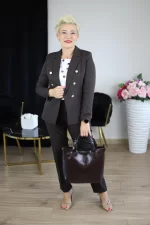 Elegancki damski garnitur, który podkreśla sylwetkę, nadając jej profesjonalny, a zarazem kobiecy charakter. Klasyczna marynarka z ozdobnymi guzikami na rękawach oraz lekko taliowany fason zapewniają wyrafinowany wygląd, a spodnie o prostym kroju z wysokim stanem gwarantują wygodę i swobodę ruchów. Idealny wybór na formalne spotkania i biznesowe wyjścia, łączący w sobie szyk i nowoczesność.