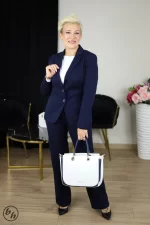 Elegancki garnitur damski który sprawdzi się zarówno w pracy, jak i na bardziej formalne okazje. Marynarka zapinana na dwa guziki pięknie podkreśla sylwetkę, a lekko taliowany krój dodaje kobiecego charakteru. Proste, lekko rozszerzane spodnie optycznie wydłużają nogi i zapewniają komfort noszenia. Całość wykonana jest z przyjemnego w dotyku materiału, który układa się idealnie.