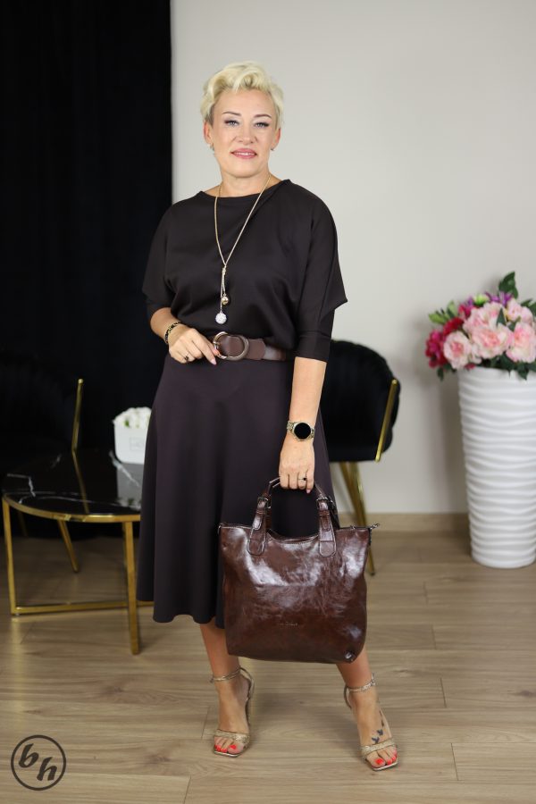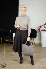 Spódnica midi o rozkloszowanym fasonie, sięgająca do połowy łydki. Wykonana jest z materiału, który pięknie układa się w ruchu. Taliowany fason podkreśla sylwetkę, a rozszerzający się dół dodaje jej elegancji i swobody. Spódnica idealnie sprawdzi się zarówno w stylizacjach codziennych, jak i bardziej formalnych, w zależności od dobranych dodatków.