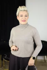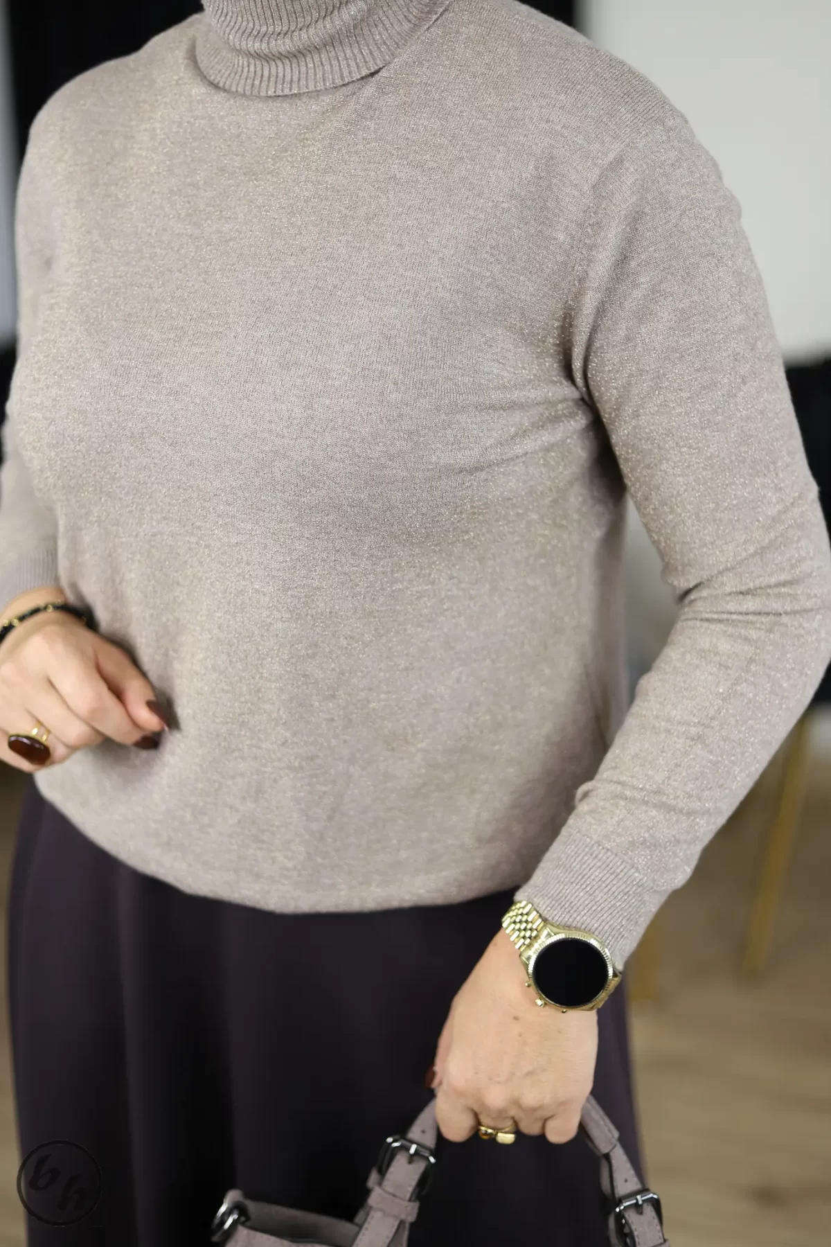 Golf charakteryzuje się subtelnym, migoczącym wykończeniem, które dodaje elegancji i głębi. Jego wysoki kołnierz zapewnia ciepło i klasyczny wygląd, a miękka tkanina idealnie układa się na sylwetce, oferując komfort noszenia. Długie rękawy i dopasowany fason sprawiają, że jest to idealny wybór zarówno do stylizacji codziennych, jak i na bardziej wyrafinowane okazje.