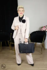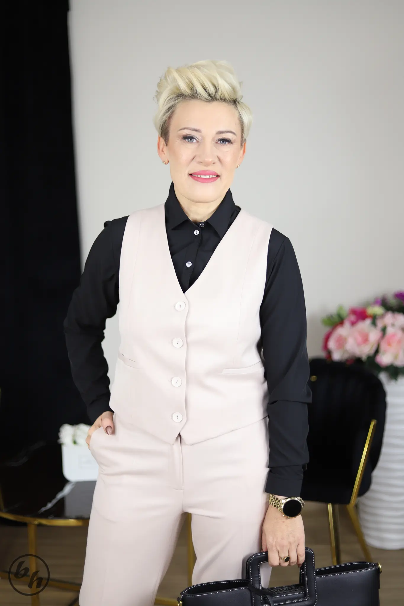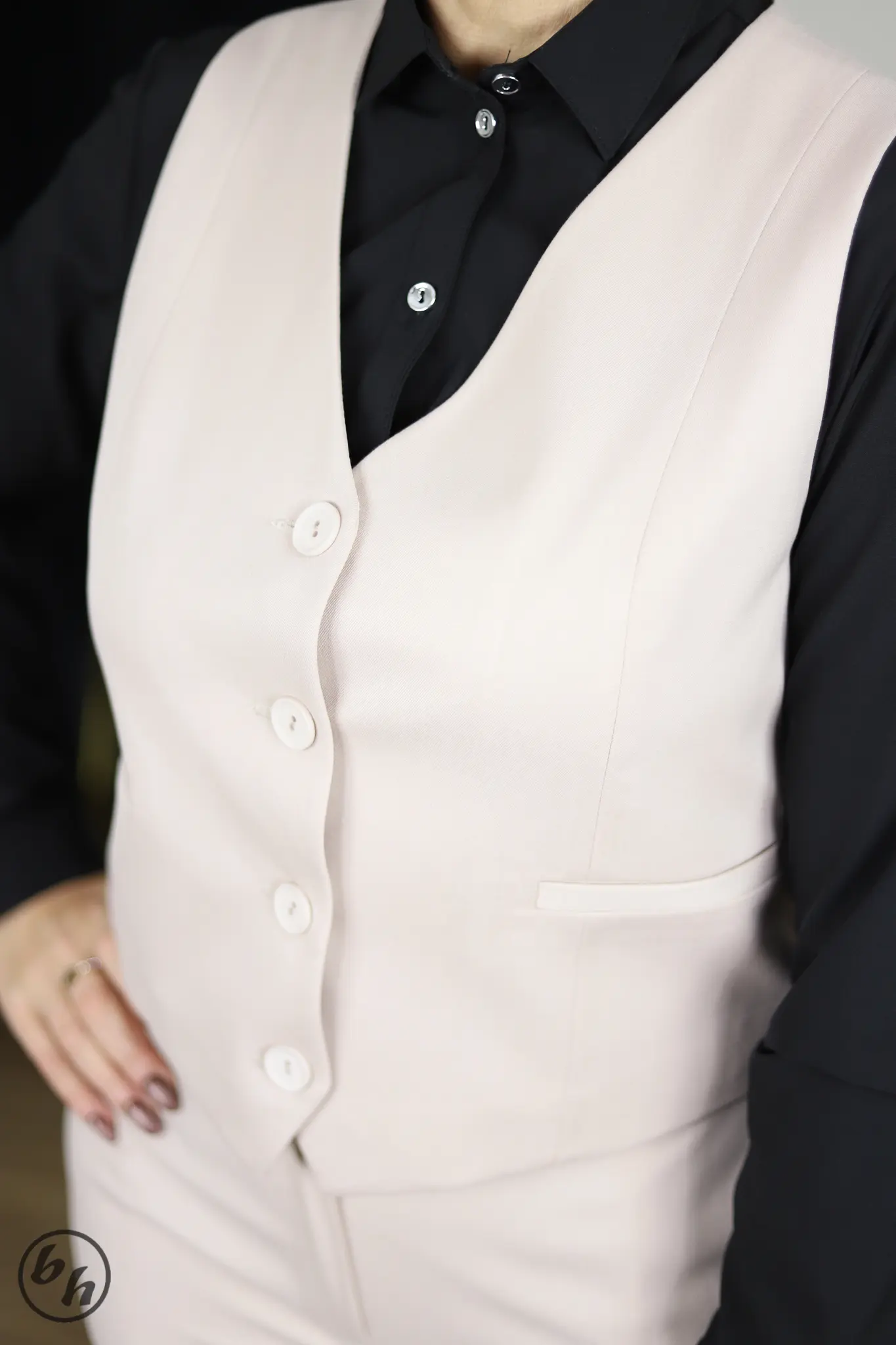 Kamizelka jest częścią formalnego, damskiego garnituru. Jest to kamizelka z pełnym przodem i tyłem, zapinana na środku na guziki, które stanowią centralny element dekoracyjny. Krój kamizelki jest dopasowany do sylwetki, podkreślając talię, co widać po subtelnych zaszewkach i linii bocznej. Materiał jest gładki, matowy i strukturalny, co nadaje całości eleganckiego i profesjonalnego wyglądu.