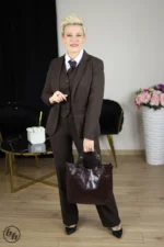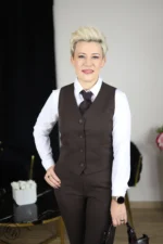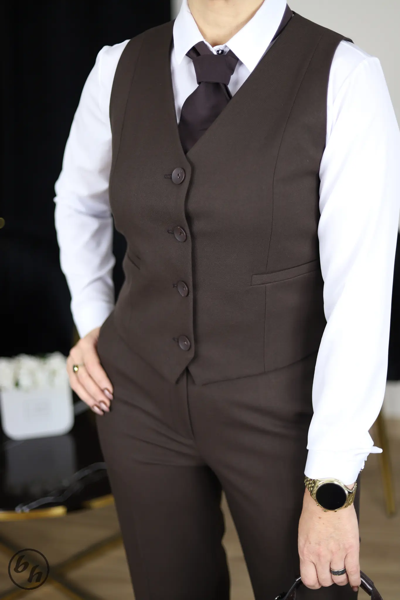 Kamizelka jest częścią formalnego, damskiego garnituru. Jest to kamizelka z pełnym przodem i tyłem, zapinana na środku na cztery kontrastujące, ciemne guziki, które stanowią centralny element dekoracyjny. Krój kamizelki jest dopasowany do sylwetki, podkreślając talię, co widać po subtelnych zaszewkach i linii bocznej. Materiał jest gładki, matowy i strukturalny, co nadaje całości eleganckiego i profesjonalnego wyglądu.