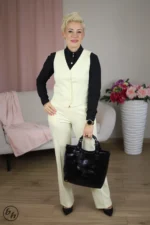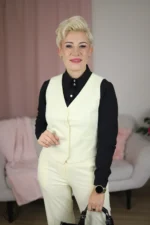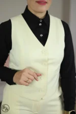 Kamizelka jest częścią formalnego, damskiego garnituru. Jest to kamizelka z pełnym przodem i tyłem, zapinana na środku na guziki, które stanowią centralny element dekoracyjny. Krój kamizelki jest dopasowany do sylwetki, podkreślając talię, co widać po subtelnych zaszewkach i linii bocznej. Materiał jest gładki, matowy i strukturalny, co nadaje całości eleganckiego i profesjonalnego wyglądu.