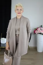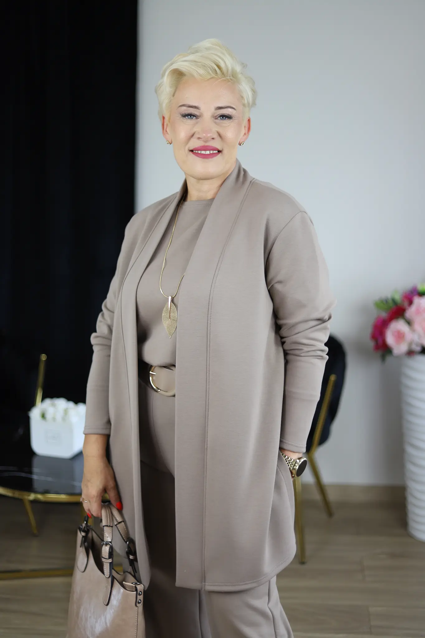 Kardigan masełko to połączenie elegancji i komfortu. Wykonana z miękkiego, lejącego materiału pięknie układa się na sylwetce, a przedłużany fason optycznie wysmukla. Idealna do pracy, na rodzinne uroczystości czy codzienne wyjścia – uniwersalna baza wielu stylizacji.