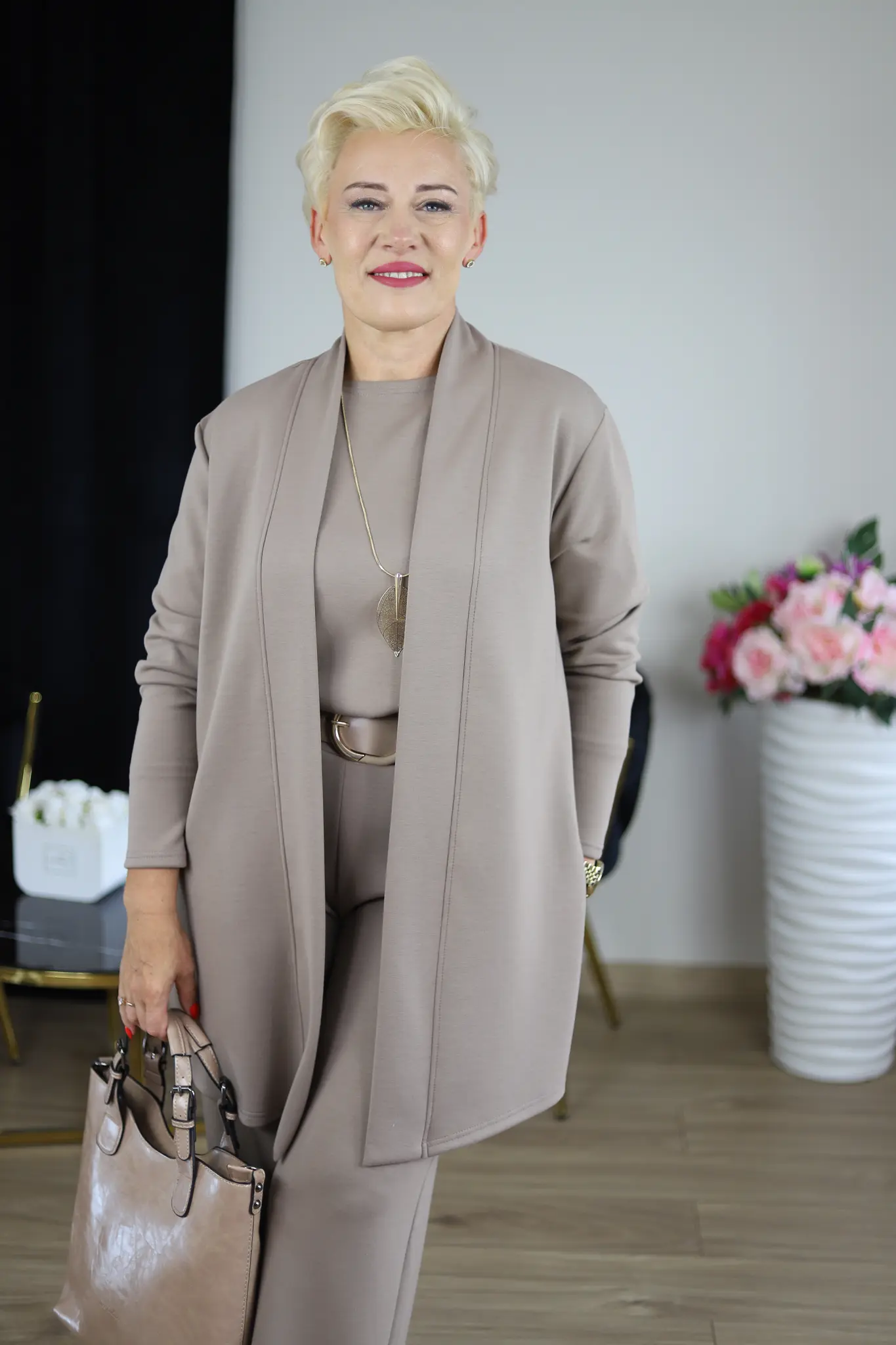 Luźny fason. Nie zapinany żakiet z klasycznymi klapami, lekko przedłużany. Z rękawem trzy czwarte z podpięciem. Spodnie z gumką w pasie oraz dwoma bocznymi kieszeniami. Tworzą piękny, elegancki i bardzo szykowny damski garnitur, który sprawdzi się na wiele okazji.