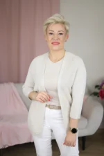 Wygodny kardigan wykonany z miękkiej dzianiny o wyraźnym, strukturalnym splocie. Sweter o prostym kroju, bez zapięcia. Klasyczny, gładki przód doskonale komponuje się z różnymi stylizacjami, od codziennych po bardziej eleganckie. Kardigan o optymalnej długości sięgającej do bioder to niezastąpiony element garderoby na chłodniejsze dni, zapewniający komfort i swobodę ruchów.