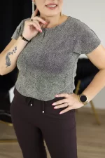 Idealna propozycja na wieczorne wyjścia lub specjalne okazje, łącząca elegancję z wygodą. Góra kombinezonu w kolorze złoto-srebrnym, z metalicznym, lśniącym wzorem. Ma krótki rękaw i półokrągły dekolt z subtelnym rozcięciem, które dodaje jej lekkości.  Dół kompletu stanowią spodnie. Wygodny, luźny fason nogawek optycznie wydłuża sylwetkę i gwarantuje komfort noszenia przez cały dzień.