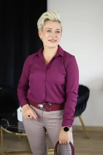 Stylowa, dopasowana koszula w kolorze śliwkowym. Wykonana z wysokiej jakości materiału, zapewnia komfort noszenia przez cały dzień – zarówno w pracy, jak i na specjalne okazje. Posiada klasyczny kołnierzyk i zapięcie na guziki, które dodają całości elegancji. Świetnie prezentuje się zarówno wpuszczona w spodnie lub spódnicę, jak i noszona luźno.
