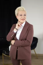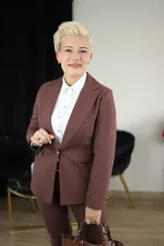 Marynarka o dopasowanym kroju podkreśla sylwetkę, a klasyczny kołnierz oraz delikatne wykończenia dodają jej stylu i formalnego charakteru. Spodnie w tym samym odcieniu doskonale komponują się z marynarką, tworząc spójną całość, która sprawdzi się zarówno w biurze, jak i na eleganckich spotkaniach. To doskonały wybór dla nowoczesnych kobiet, które chcą wyglądać profesjonalnie, nie rezygnując z kobiecego wdzięku.