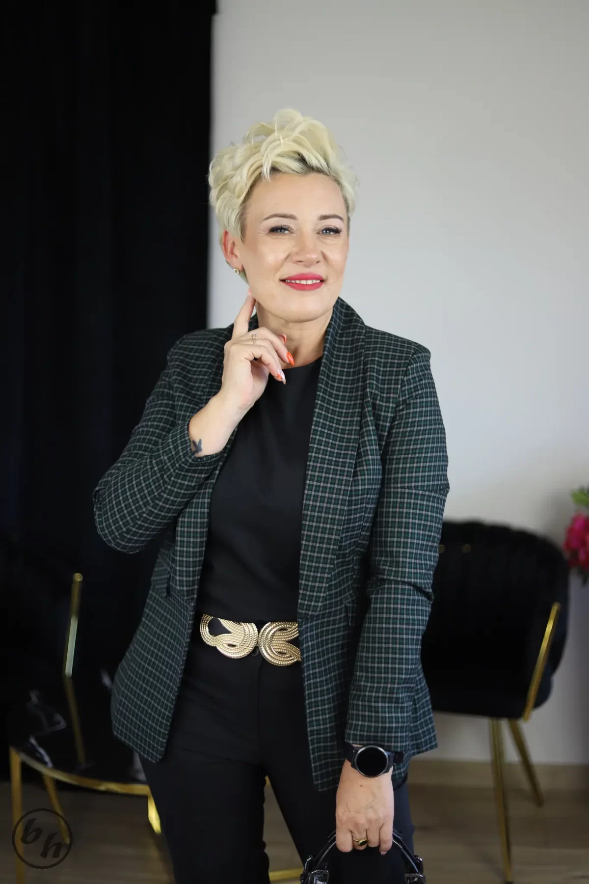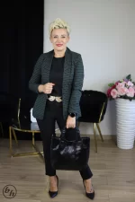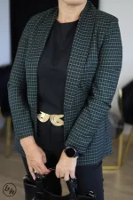 Elegancki model w klasyczną kratkę w odcieniach zieleni, czerni i delikatnego fioletu. Posiada lekko taliowany fason, który ładnie podkreśla sylwetkę, a brak guzików nadaje jej nowoczesny, lekko nonszalancki charakter. Sprawdzi się zarówno do stylizacji biurowych, jak i na co dzień — zestawiona z jednolitym topem i spodniami tworzy elegancki, dopracowany look. Idealna dla kobiet ceniących klasykę z nutą współczesnej elegancji.