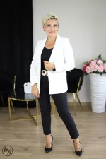 Marynarka damska to elegancki i stylowy element garderoby, który dodaje pewności siebie i klasy każdej kobiecie. Wykonana z wysokiej jakości materiałów, zapewniających komfort noszenia, ta marynarka jest idealnym wyborem na wiele okazji, zarówno formalnych, jak i nieformalnych. Marynarka posiada klasyczny krój, który podkreśla kobiecą sylwetkę. Jest lekko taliowana, co nadaje jej elegancji i doskonale podkreśla kobiece kształty. Długość marynarki sięga linii bioder, co dodaje jej uniwersalności i sprawia, że pasuje do różnych stylizacji.