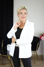 Dwurzędowa marynarka w kolorze ecru, ozdobiona eleganckimi, srebrnymi guzikami. Fason o lekko taliowanym kroju pięknie modeluje sylwetkę, a klasyczne klapy dodają jej szyku. Wykonana z wysokiej jakości materiału, zapewnia komfort noszenia i świetnie komponuje się zarówno ze spodniami, jak i sukienkami czy jeansami.