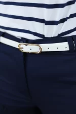 Cienki pasek ma subtelny, elegancki design, który świetnie sprawdza się w minimalistycznych stylizacjach. Wykonany jest z gładkiego materiału o jednolitej fakturze, co nadaje mu ponadczasowego charakteru. Jego głównym elementem ozdobnym jest mała, klasyczna klamra w metalicznym odcieniu, która jest zarówno funkcjonalna, jak i estetyczna.