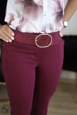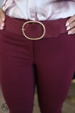 Szeroki pasek w kolorze bordowym. Pasek ma dużą, owalną klamrę w kolorze złotym.
