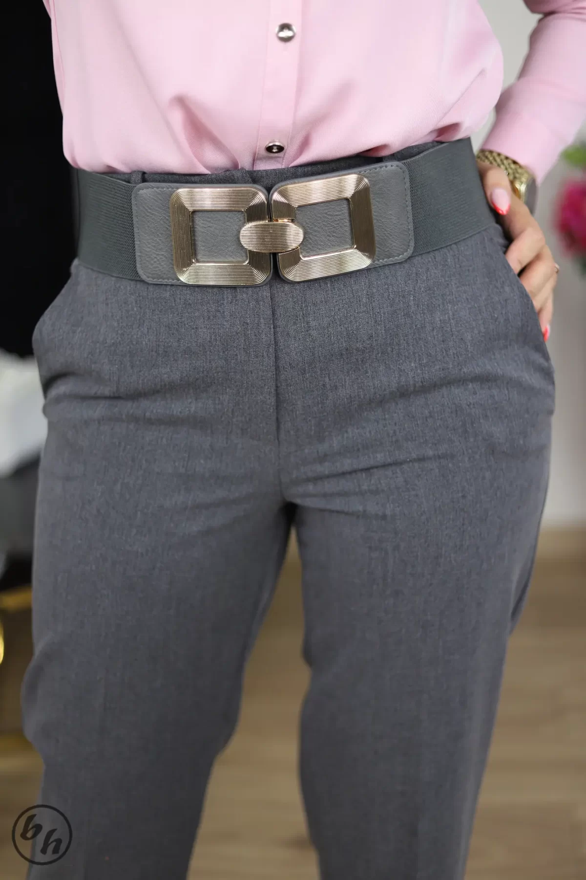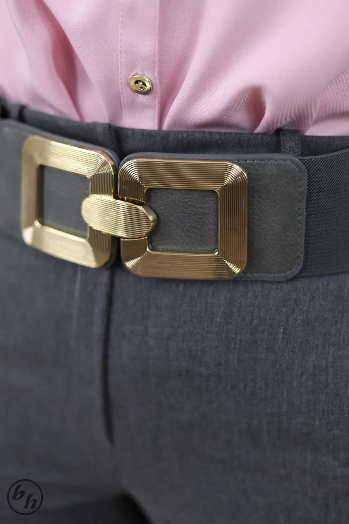 Szeroki, elastyczny model o wyrazistym, nowoczesnym designie, idealny do podkreślenia talii w eleganckich i biznesowych stylizacjach. Centralnym punktem jest duża, efektowna klamra o geometrycznym kształcie. Składa się ona z dwóch oddzielnych, kwadratowych ramek w kolorze złotym.